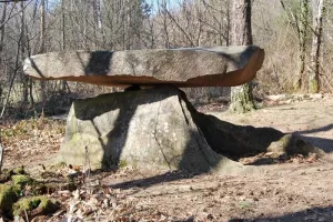 En gneiss rose (pierre d'Aubazine), formé de 3 pilliers. Ce monument date du Mégalithique, dernier étage de l'époque néo...