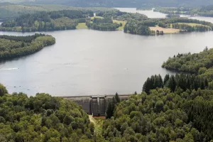 Le barrage de Vassivière est un ouvrage de type « poids rectiligne ». Haut de 32,9 m et long de 220 m, il présente une b...